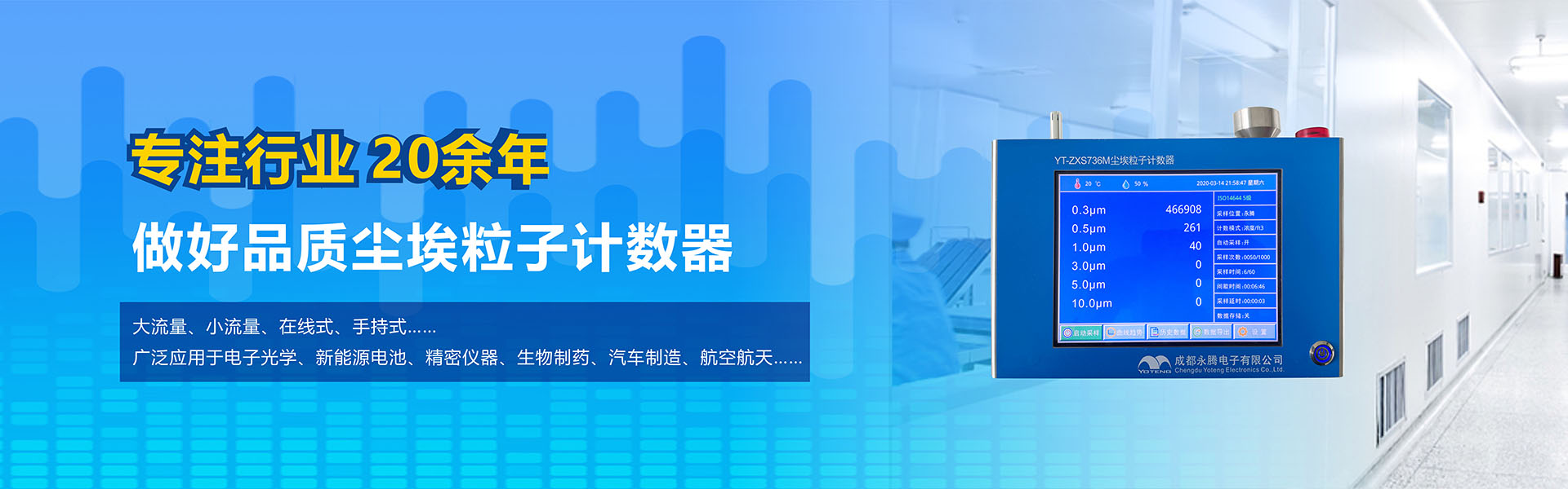 成都永騰電子有限公司位于成都市國家經(jīng)濟技術開發(fā)區(qū),是一家專業(yè)從事環(huán)境空氣監(jiān)測儀器研發(fā)、生產、銷售于一體的高科技企業(yè)。產品涵蓋空氣檢測儀器、潔凈間在線塵埃粒子計數(shù)器監(jiān)測系統(tǒng)、大氣顆粒物監(jiān)測微站系統(tǒng)、電化學分析儀器、實驗室設備等產品。